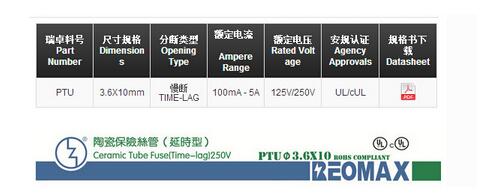 產(chǎn)品名稱: PTU 3.6*10陶瓷慢斷保險絲