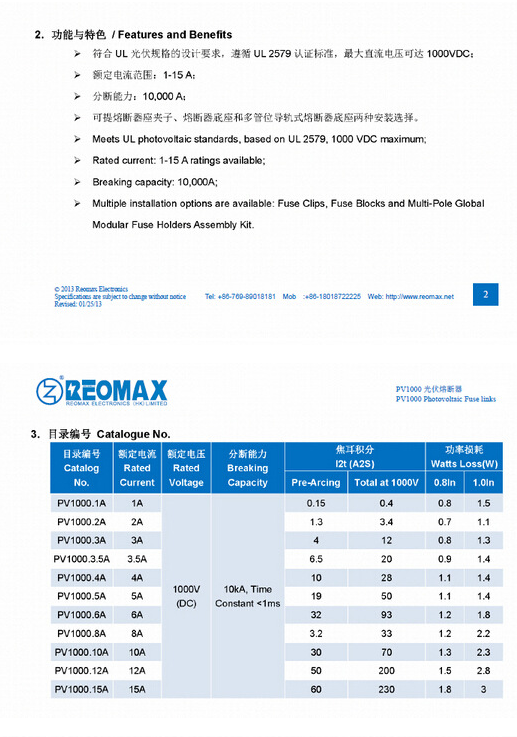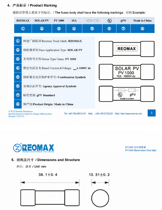 產(chǎn)品名稱: 1000Vdc REOMAX光伏熔斷器10X38mm PV1000