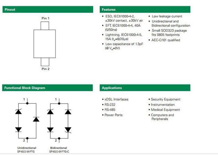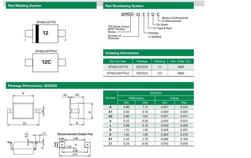 產(chǎn)品名稱(chēng): SP4022 Series 1.3pF, 15A Discrete TVS Diode
