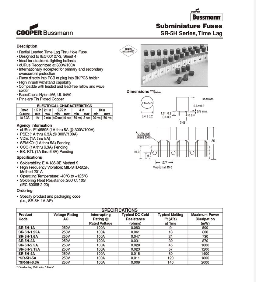 產(chǎn)品名稱: SR-5H-1A-AP 250Vac 高分?jǐn)?微型塑封保險(xiǎn)絲