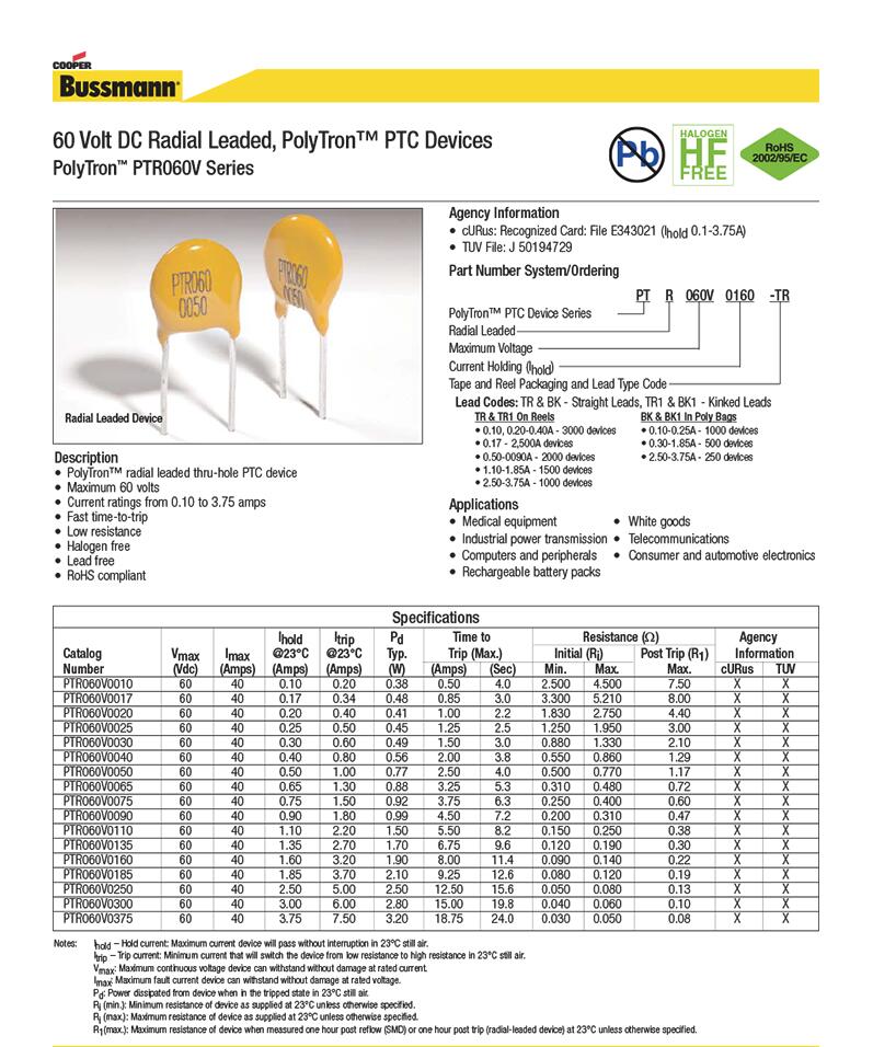 產品名稱: PTR060V0090-TR 可恢復保險絲 圓形 插件保險絲