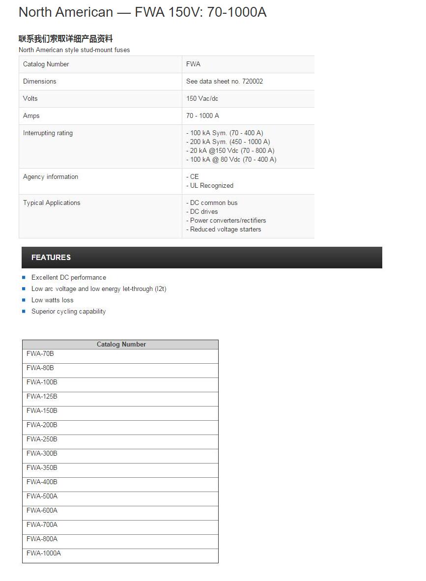 產(chǎn)品名稱: 美標(biāo) FWA 150V: 70-1000A快速熔斷器
