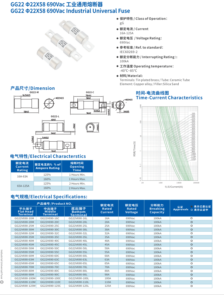 產(chǎn)品名稱(chēng): 工業(yè)通用熔斷器CG22 22*58 690VAC INDUSTRIAL Universal Fuse